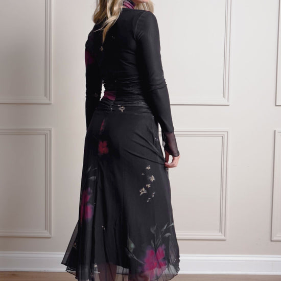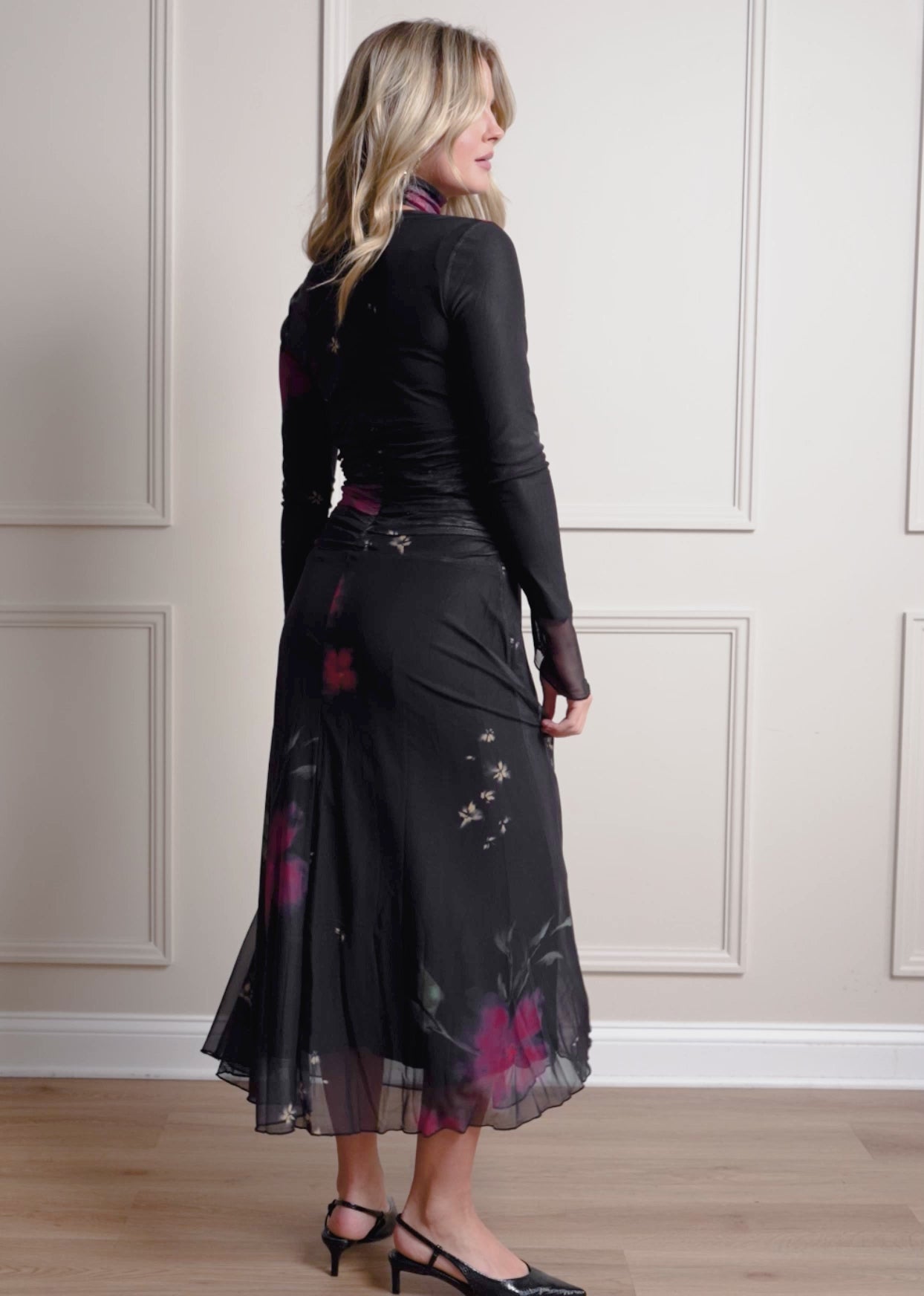 A timeless statement piece, the Floral Mesh Maxi Dress features a delicate black mesh base adorned with pink and red florals. Designed with ruching at the waist for a flattering silhouette, this dress effortlessly blends romance and sophistication. Perfect for special occasions or an elevated evening out, it transitions seamlessly through the seasons — pair it with boots for a chic winter look or sandals for warm summer nights.