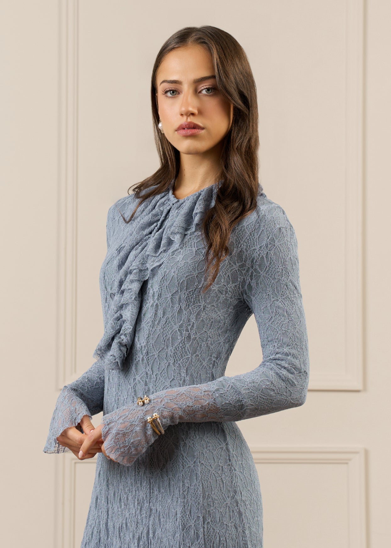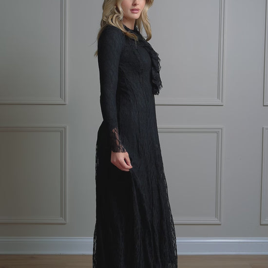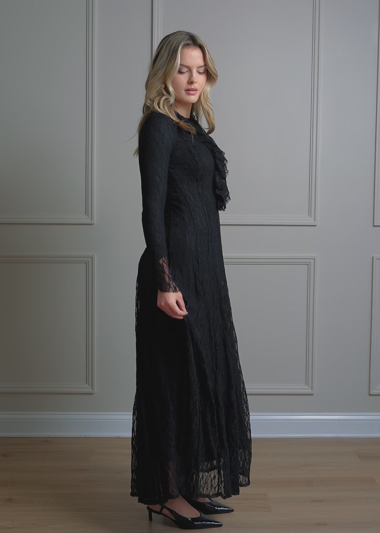 Modern vintage at its finest. Crafted from soft stretch lace that flatters and moves effortlessly, this maxi dress blends timeless romance with contemporary ease. The removable ruffled neckline adds a hint of old world charm when styled up — or a clean, modern silhouette when worn off. Available in classic black and dreamy dusty blue, it’s made for weddings, and every unforgettable moment in between.